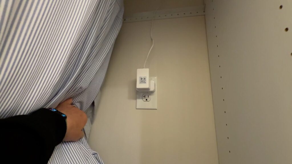 That gives bright, even light across hanging clothes, shelves, and the back wall. It also cuts shadows better than a single overhead light. Plug the LED strip power supply into a smart plug. In this setup, the smart plug door open light behavior comes from Home Assistant turning that plug on and off.